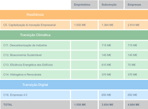 O montante financeiro do PRR ascende a 16, 6 mil M€, dos quais 13, 9 mil M€ correspondem a subvenções. As autoridades nacionais reavaliarão, no segundo semestre de 2022, o recurso adicional até 2,3 mil M€ de apoios através de empréstimos, em função do nível da procura gerada no PRR em medidas de apoio às empresas, designadamente no domínio da Capitalização e Inovação Empresarial e em função da dinâmica das finanças públicas.