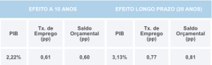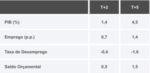 Em termos de impacto macroeconómico do PRR no país, as previsões (realizadas em abril 2021) apontam para um diferencial no PIB, na Taxa de Emprego e no Saldo Orçamental, tanto em termos e médio prazo: